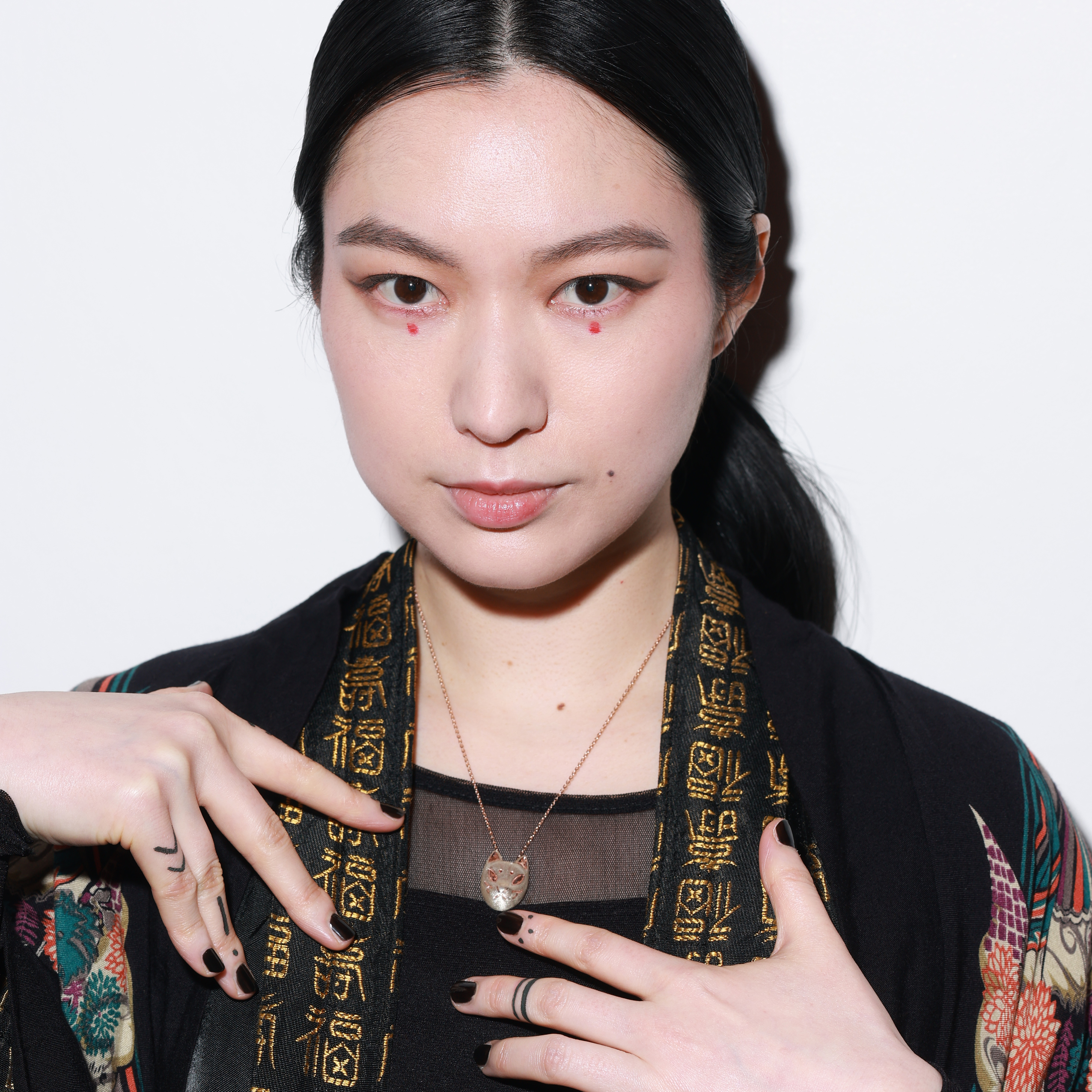 左右の麻呂眉には、ふくしひとみの誕生石であるガーネットをあしらっています。